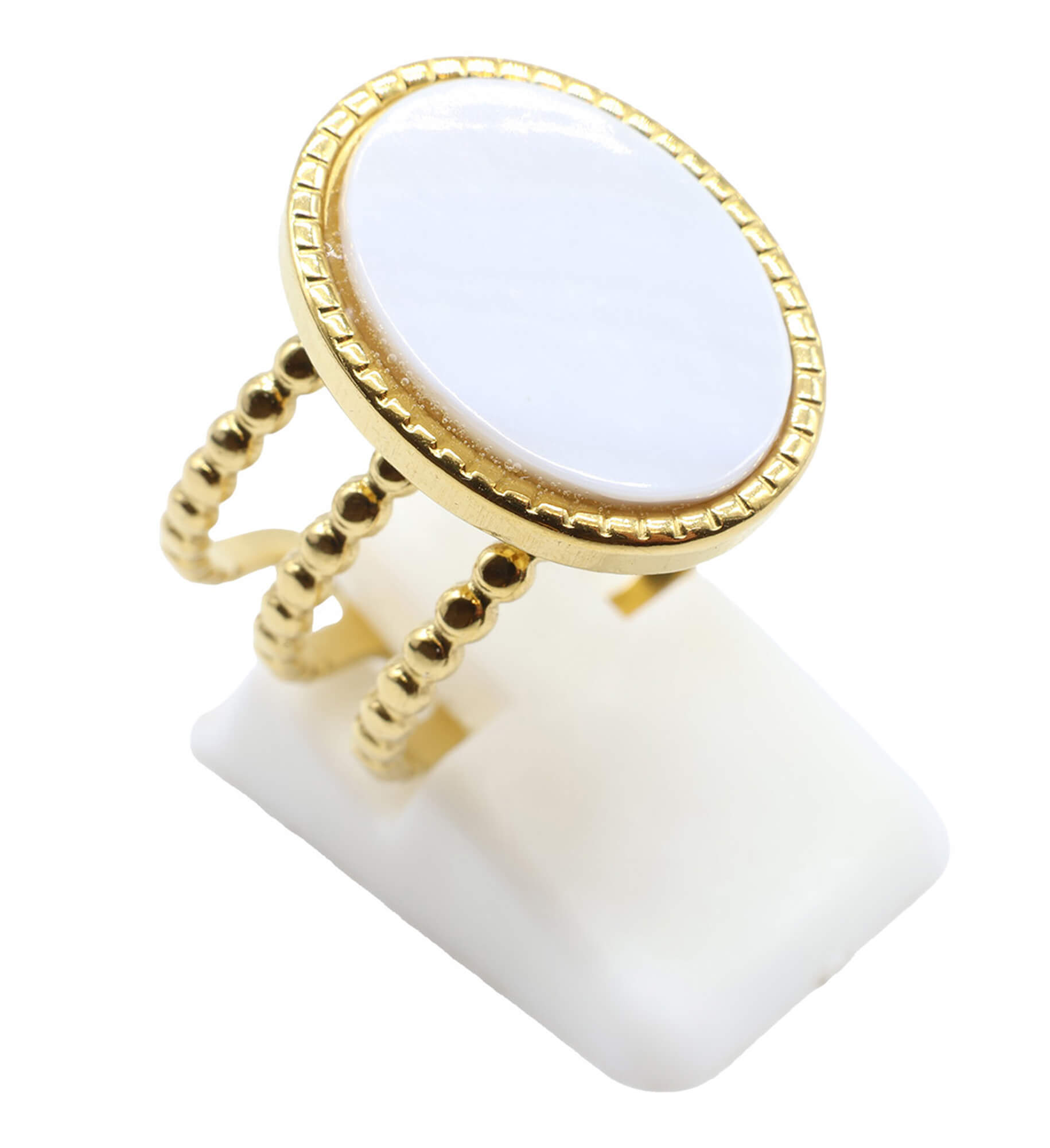 Venda por grosso de anéis em aço inoxidável dourado (Nitrato de Titânio). Alguns anéis são ajustáveis, outros vendidos em tamanho único, para descobrir em cada ficha de produto.