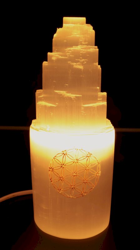 Lâmpada Selenite Montagne Gravée 20cm - Flor de Vie