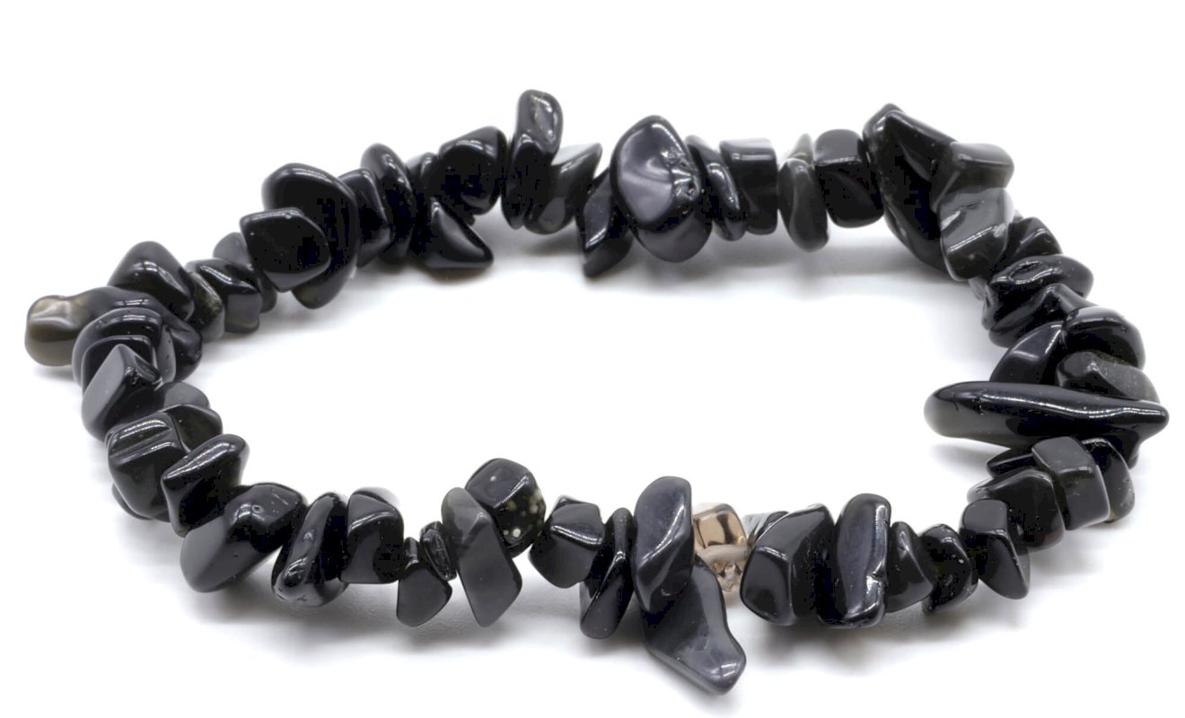 Pulseira elástica em lascas de pedras d'Obsidiana Preta. Tailo universelle.